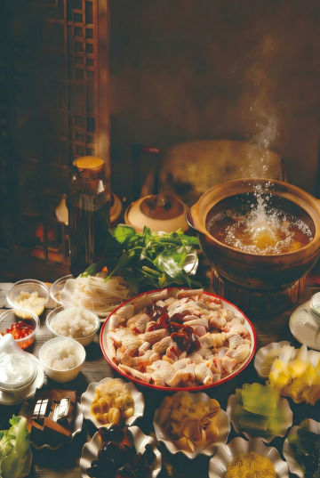 温暖的室内灯光下,热气腾腾的鸳鸯火锅置于餐桌中央,红汤翻滚着辣椒与花椒,清汤漂浮着菌菇与葱段,周围摆满了新鲜的肥牛卷、虾滑、蔬菜拼盘、毛肚、炸酥肉等各式火锅食材,蒸汽氤氲缭绕,营造出热闹诱人的火锅盛宴氛围,整体色调温暖浓郁,细节清晰,充满食欲感,具有高度写实的摄影风格和丰富的层次感。