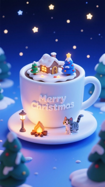 毛绒质感的圣诞树搭配3D微缩艺术风格,卡通化圣诞老人与驯鹿穿梭其间,彩球、礼物堆叠如毛线球,营造出温暖喜庆、趣味十足的节日氛围。