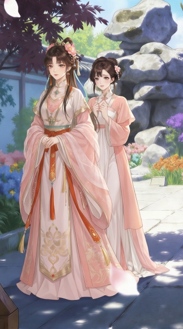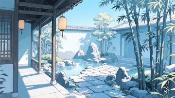 中式古典插画风,清新雅致的庭院景观,石径通幽,绿树成荫。
