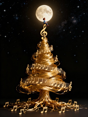 俯瞰视角,一个由无数纤细银丝编织而成的巨大高音谱号悬浮在深邃的午夜蓝背景中,银丝表面泛着柔和的月光光泽,螺旋结构在中心处逐渐汇聚成一颗跳动的液态银珠。围绕这个核心,二十三个大小不一的音符如同被无形的引力牵引,沿着黄金螺旋轨迹排列成精密的银河漩涡——十六分音符化作微小的流星尾迹,四分音符变成棱角分明的星舰轮廓,八分音符则扭曲成时空涟漪的形状。最外围有三个半透明的音乐符正在缓慢崩解成闪烁的粒子流,而内侧则有新生的银色声波图案正从虚无中凝聚成形。所有元素都沐浴在三种光线中:核心的银白脉冲光、边缘的靛蓝星云光,以及背景中若隐若现的暗红色宇宙尘埃反光,整体呈现出音乐在时空维度中流动、生成与消散的永恒循环。