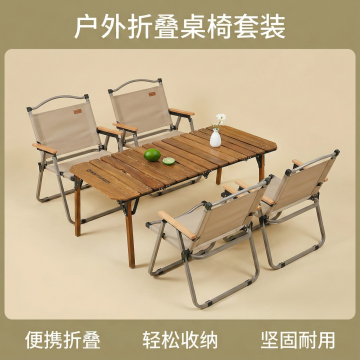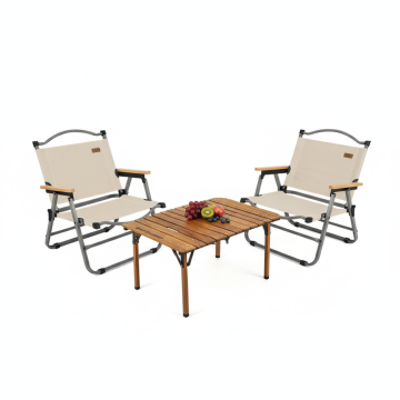 使用提供的参考图生成户外折叠桌椅套装产品展示图:包含 2 把带木质装饰框架的浅卡其色布面折叠椅(椅面带小型品牌标签)、用图二棕色木纹长条形折叠桌;桌面上摆放装饰元素:1 个完整青柠 + 1 片青柠切片、1 个白色迷你小花瓶(插 1 支白色小花)