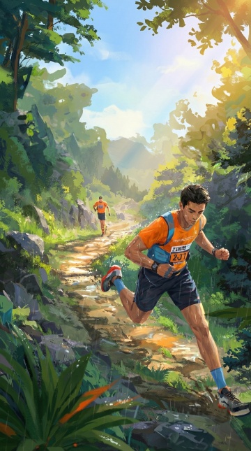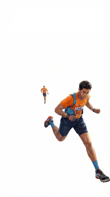 一张充满活力的运动场景照片,展现一位男性运动员在不同运动场景中的动态瞬间。画面采用低角度仰拍,捕捉人物充满力量感的肢体动作和运动姿态。温暖的夕阳从侧后方照射,在人物轮廓边缘形成明亮的金色光晕,同时在地面上投射出长长的影子。天空呈现出清澈的渐变蓝色,点缀着几朵轻盈的白云。人物穿着运动背心和短裤,脚上是专业的运动鞋,肌肉线条在运动中紧绷而富有爆发力。地面根据不同运动场景变化,可能是湿润的柏油跑道、红色的塑胶田径场、绿色的草地或山间小径,表面反射着阳光的光泽。背景可以是城市天际线、郊外的树林或山间的风景,营造出开阔而充满能量的氛围。整体色调以金色、橙色和蓝色为主,高对比度,清晰的细节,展现运动的速度感和力量美,捕捉运动中最具动感和张力的瞬间。