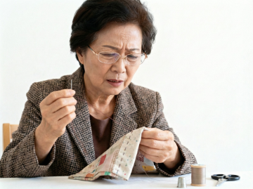 一位50岁左右的中年亚洲女性穿着时髦,让她带着老花镜看药瓶,看不清,一脸困惑,4K画质,比例4:3