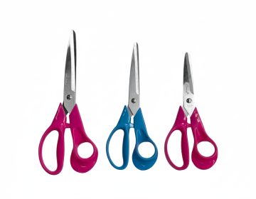 六把不同造型的剪刀系列素材集合,每把剪刀保持金属刀刃的光泽质感与黑色塑料手柄的材质对比,分别呈现完全不同的开启角度、手柄弧度和刀刃形状,以规整的网格排布于纯色背景上,整体采用统一的写实摄影风格,光线从左上方45度角照射形成自然阴影,色彩变换为清新的蓝绿色调,画面简洁无文字信息,突出剪刀的功能性设计美感与系列化视觉统一性。