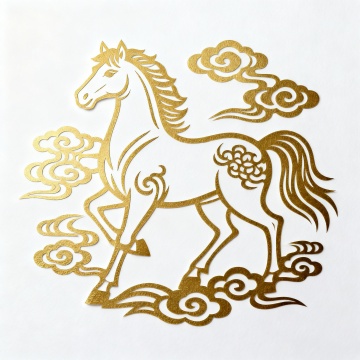 红金双色剪纸风骏马,融合中式云纹与花卉元素,鎏金质感凸显国潮喜庆,传递浓郁民族年味。