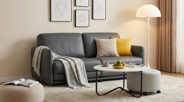 现代简约风格的客厅室内设计,主体为一个线条流畅、造型独特的模块化布艺沙发,沙发采用深灰色高级绒布面料,搭配几个不同大小和纹理的几何图案靠垫,沙发下方是纤细的金属支撑腿。客厅整体色调以冷静的灰蓝色为主,墙面为浅灰色哑光质感,地面铺设浅色宽木地板。左侧有一扇大窗户,悬挂着半透明的浅灰色垂坠感窗帘,阳光透过窗户柔和地洒入室内。沙发前铺着一块浅灰色带有细腻纹理的长方形地毯,地毯上放置一个圆形黑色金属框架小茶几,茶几上摆放着一本翻开的设计杂志和一个简约的陶瓷花瓶。沙发后方的墙上挂着一幅抽象的几何线条装饰画,画框为细黑色。右侧角落放置一盆大型的琴叶榕绿植,增添自然气息。天花板中央悬挂着一盏造型简约的黑色金属吊灯,灯光温暖柔和,营造出宁静、舒适且富有设计感的居住氛围。整个空间布局合理,注重留白和线条的简洁,展现出北欧极简主义的设计美学。