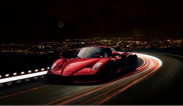 赛博朋克风格的未来都市夜景,一辆流线型设计的亮红色超级跑车在湿滑的街道上高速行驶,车身带有锐利的棱角和巨大的尾翼,车头灯发出明亮的蓝白色光芒,地面反射着霓虹灯光形成彩色光轨,周围是高耸入云的摩天大楼,楼体上布满闪烁的电子广告牌和发光霓虹招牌,整体画面充满动感与速度感,色彩以深蓝、紫色、粉色和红色为主色调,光影对比强烈,营造出繁华而迷离的未来都市赛车氛围。