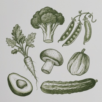 纯色背景,手绘线描风格,以绿色线条勾勒六个完全不同类型的蔬菜,包括完整形态和剖面细节,保持线条流畅细腻、轮廓清晰、细节丰富的特点,规整排布成集合素材,整体呈现简洁自然的插画感。