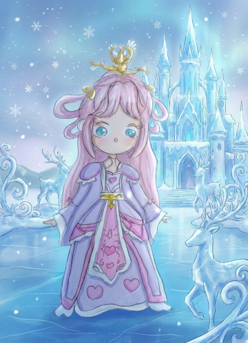 梦幻感十足的卡通插画风,软3D质感融合水彩晕染,呈现冬日童话场景,可爱公主与冰晶鹿群共舞于冰雪城堡前,传递温暖节日氛围。