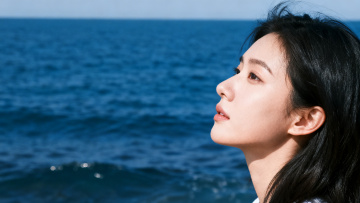 写实风格人像摄影,美女主体,棕色微卷长发,明亮有神的眼睛,自然微笑,柔和面部光影,阳光明媚的午后光线,温暖柔和的色调,波光粼粼的蓝色湖面背景,湖边木质栈道环境,穿着米色针织开衫搭配白色吊带裙,浅色系穿搭,发丝随风轻扬,清晰的皮肤质感,自然的妆容,高清晰度,浅景深,人物居中构图,宁静惬意的氛围。