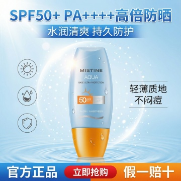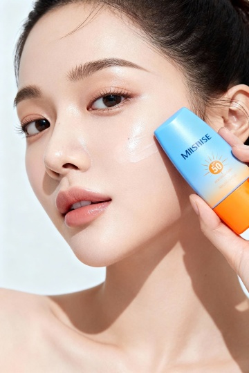 一只手握着一瓶防晒霜喷雾,喷雾正从瓶口喷出,形成白色的雾状。整体画面采用温暖的橙色和黄色作为主色调,背景是明亮的橙黄色天空,点缀着少量白色云朵。防晒霜瓶身主体为柔和的暖橙色,瓶身上有白色的“SPF 50”字样和相关标识,喷雾的白色与瓶身及背景的暖色调形成鲜明对比,营造出温暖、活力的夏日氛围。光线明亮柔和,从斜上方照射,在手和瓶身上形成淡淡的阴影,增强立体感。