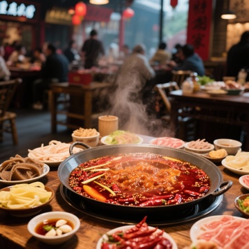 热气腾腾的重庆火锅,沸腾的红油锅底点缀着辣椒和花椒,周围摆放着新鲜的肥牛卷、虾滑、毛肚、鸭肠、蔬菜拼盘等食材,暖色调灯光营造出温馨热闹的氛围,木质餐桌上摆满了各式菜品,蒸汽袅袅升起,充满食欲感和烟火气