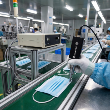 现代化高科技实验室场景,画面干净规整,适合作为背景。明亮的白色与蓝色调为主,洁净的白色墙面镶嵌着深蓝色方块瓷砖,地面为光滑的浅灰色。前景有两位身着全套白色防护服、佩戴护目镜和口罩的科研人员,一位正坐在操作台边专注查看电脑屏幕,另一位站立于大型精密仪器前操作控制面板。实验室中央和后方分布着多台先进的白色与银色相间的分析仪器、设备,带有蓝色显示屏和控制面板,仪器间有金属管道和电缆有序连接。右侧有机械臂装置,左侧前景有透明玻璃容器和绿色植物点缀。整体光线均匀柔和,以冷色调为主,营造出专业、严谨、先进且一尘不染的科研氛围,构图平衡,空间感强,视觉层次分明,信息传达清晰,符合高科技科研环境的审美与功能需求。