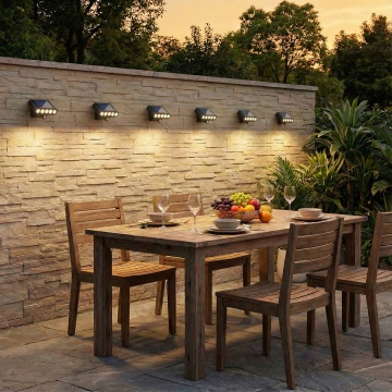 有5个产品安装户外的楼梯扶手上,分布均匀放在一边的扶手上,灯光照射楼梯, 远景能看到整个楼梯 灯亮着暖光
