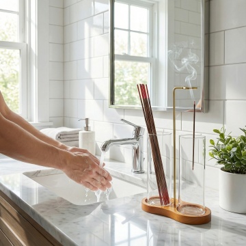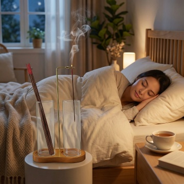 暖光轻雾萦绕,木雕风床头柜上简约加湿器静置,柔光透帘,营造冬日温馨实景感,轻拟物设计呼应自然舒适。