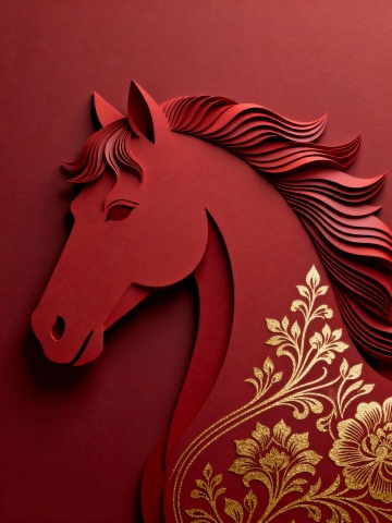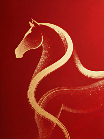 梦幻感与唯美感交织,白描线条勾勒骏马轮廓,粒子风点缀星芒,浮雕质感跃然纸上,插画风呈现优雅意境,暗红底色衬托节日祥瑞之气。