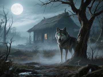 3D风拟人狼战士,毛发旺盛,手持巨斧,超现实主义风格,森林中散发神秘感。