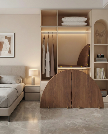 把这两个图结合在一起变成新的场景图,把图1的橱柜换成图2的衣柜,图1的场景变成卧室场景,体现折叠后的桌面的收纳功能放柜子里面、放墙边靠墙