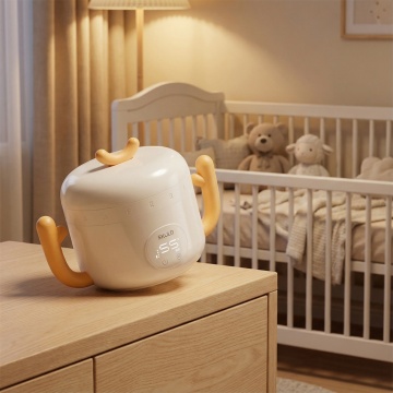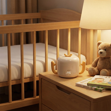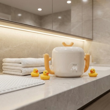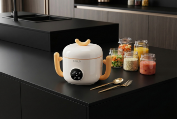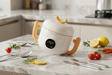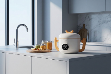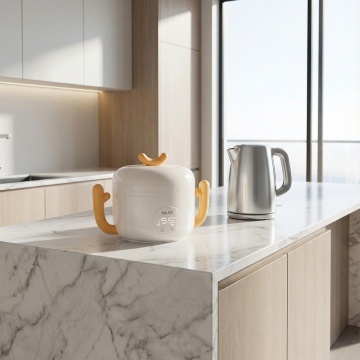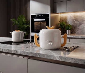 米白色电饭煲,周围环绕厨房台面及新鲜食材(白米、稻穗、绿叶蔬菜),现代简约风格,温馨自然氛围,明亮柔和光线,高清质感,白色背景的要求,