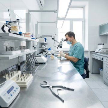 生成 石膏剪,剪石膏牙齿模型的这个产品的展示图,使用图片素材,石膏手柄被握住,背景是高端牙科技工室,欧美医生工作场景