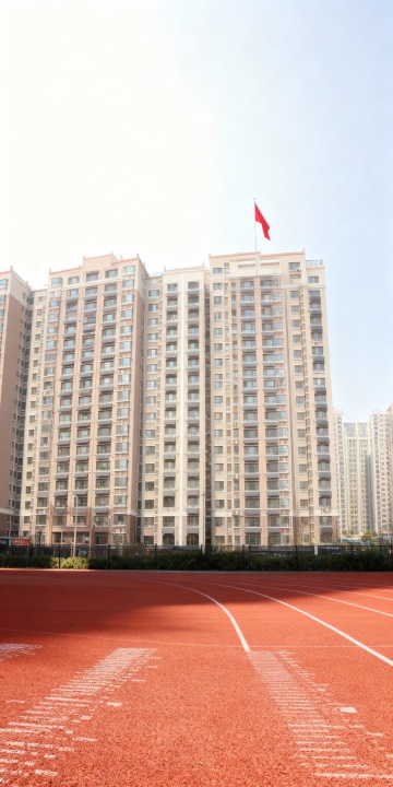 广角俯拍视角,现代化中学体育场的黄昏全景,深红色塑胶跑道在夕阳下泛着温暖光泽,六道白色分道线如钢琴键般延伸至画面深处,弯道处有几个穿着蓝白校服的学生正在进行变速跑训练,他们的影子被拉得很长。跑道内侧是修剪整齐的深绿色人工草坪,几名女生正围坐成圈进行拉伸运动。左侧的灰色看台坐满了观看校际足球赛的学生,他们挥动着蓝白相间的校旗,遮阳棚的金属结构在暮色中投下几何形状的阴影。背景中五层米色教学楼的窗户透出温暖的灯光,与远处渐变成粉紫色的天空形成柔美过渡,几棵高大的梧桐树在微风中摇曳,将斑驳的影子投射在跑道上。空气中弥漫着青草和塑胶的混合气味,远处传来操场广播里播放的轻音乐和学生们的欢呼声,整体色调从橙红向靛蓝渐变,营造出既充满运动活力又带着青春黄昏特有的温馨氛围。
