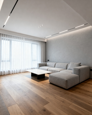 极简主义风格的室内背景,柔和的米白色墙面搭配浅木色人字拼地板,自然光透过米白色半透明窗帘洒入,营造出明亮通透、宁静舒适的氛围。房间中央摆放着一组不同设计的浅灰色布艺沙发,搭配深绿色和浅蓝色的几何图案靠垫,沙发前是一张椭圆形的黑色大理石茶几,上面放置着一个造型简约的玻璃花瓶,插着几支干枯的芦苇。墙上悬挂着一幅抽象风格的装饰画,画面以深蓝色和金色为主色调,呈现出流动的线条感。房间另一侧的墙角摆放着一盆高大的琴叶榕,种植在一个哑光白色的陶瓷花盆中。天花板上安装着一盏造型独特的黑色金属吊灯,灯光温暖柔和。整个空间的配色以低饱和度的灰色、蓝色和绿色为主,搭配原木色的自然质感,展现出简约而不失高级感的现代设计美学。