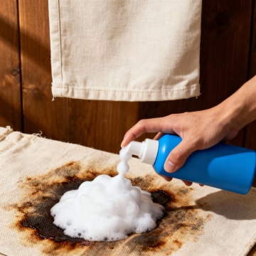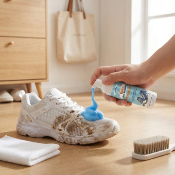 浅蓝色柔光渐变背景。产品瓶身45度角摆放,瓶口正在挤压出一团极其丰盈、稳定的云朵状白色泡沫,泡沫质感绵密,带有细微光泽。泡沫旁放置两片材质样本:一片是带有污渍的白色帆布,一片是带有污渍的灰色麂皮,每片样本的一半已被泡沫清洁并恢复洁净。画面左上角以简约线条图标形式融入三大卖点:免刷洗图标、速干图标和植物成分图标。光线柔和,突出泡沫的细腻质地与产品的温和特性。
