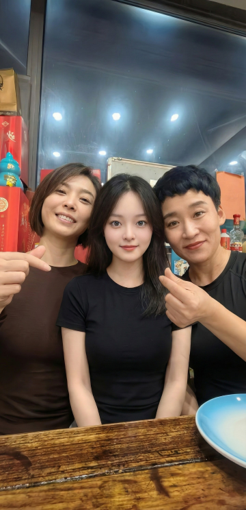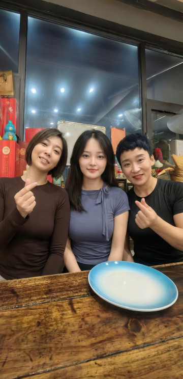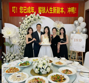 将图中桌子上菜品变成没吃过完整的菜。背景增加一些银色的气球和鲜花 多增加几个女生