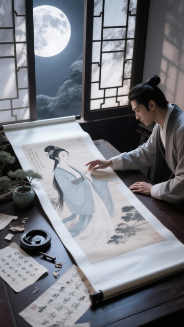 古典插画风,水墨渲染,展现古人织史成诗的雅致场景。