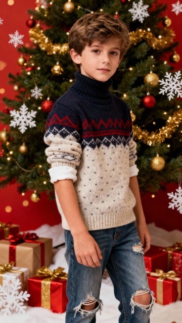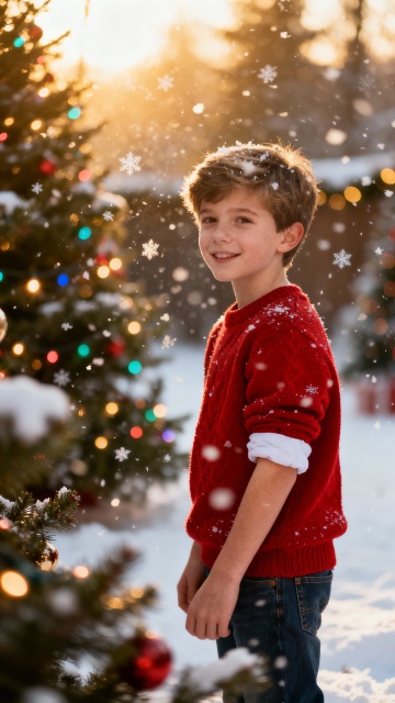 超写实风格圣诞场景,以红色和绿色为主色调,温暖柔和的侧光照明,前景是多个包装精美的圣诞礼物盒,包括红色带雪花图案、绿色带雪花图案、红色带金色条纹等款式,部分礼物盒上覆盖着少量蓬松的白雪,礼物盒周围点缀着松针和松果,背景是装饰有红色球形饰品和闪烁暖黄色串灯的圣诞树,树的枝叶上也有积雪,整体营造出温馨、喜庆、充满节日氛围的画面,不同画面的背景可替换为圣诞市场摊位、壁炉旁、挂满装饰的房间角落等具有圣诞元素的场景,保持相同的光影质感和色彩和谐度。