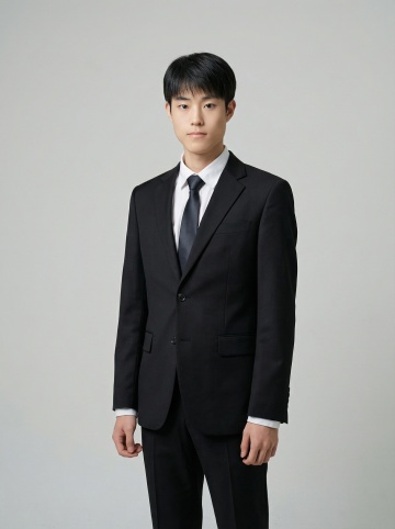 一位年轻亚洲男性,身着剪裁合体的黑色西装,内搭白色衬衫,系着黑色领带,左手自然插在西装裤口袋,右手轻握西装前襟,面带温和微笑,姿态自信挺拔,背景为纯白色,整体呈现清晰、专业、正式的商业人像摄影风格,光线均匀柔和,突出西装的挺括质感与人物的精神面貌。