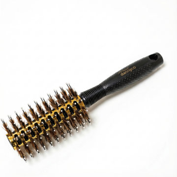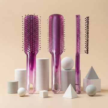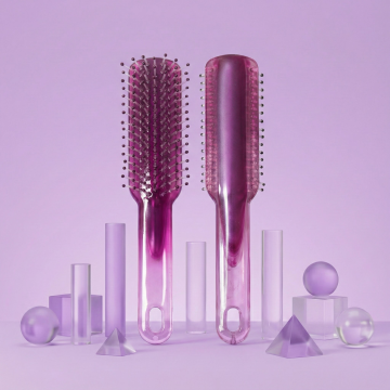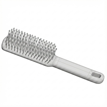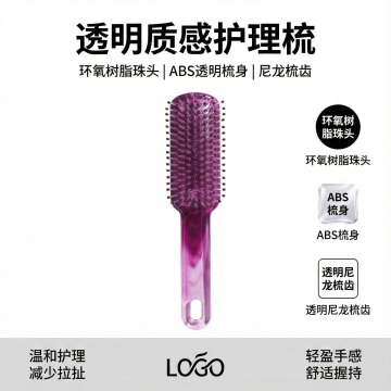 给图中的洗头刷旁边配一个它的独立包装(设计包装),包装正面有个透明的框,包装表面印有该梳子的图案线稿图及可定制logo的英文字样