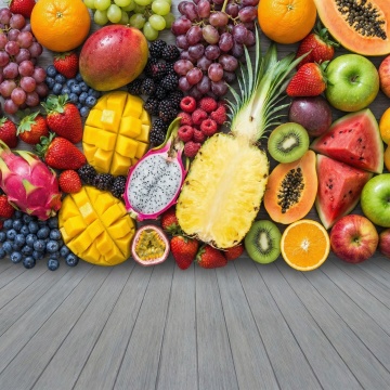高清晰商业产品摄影风格,纯白背景,六款不同样式的新鲜水果整齐排列,包含完整与切开的黄色百香果(展现内部橙黄色籽囊与白色果瓤)、新鲜青柠、红草莓、紫葡萄、绿猕猴桃、黄柠檬,每个水果表面带有自然光泽与晶莹水珠,搭配翠绿新鲜的叶片与藤蔓点缀,光线从斜上方均匀照射形成柔和阴影,色彩鲜艳饱和,细节纹理清晰可见,构图对称平衡,画面干净通透,突出水果的新鲜感与质感。