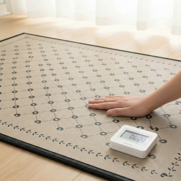 现代极简风格的客厅场景,以浅灰色调为主的现代家具布置,画面聚焦于铺在浅灰色瓷砖地面上的浅灰色条纹地毯特写,地毯表面有细腻的竖条纹纹理和柔软的编织质感,占据画面下方大部分区域;背景中可见浅灰色布艺沙发,搭配几个同色系的靠垫,沙发旁有一个圆形金属边框的小茶几,靠墙处有一个简约的灰色搁板,上面放置一个小型装饰画框;右侧是大面积的落地窗,透过轻薄的白色纱帘洒入明亮柔和的自然光,光线在地毯和地面上形成自然的光影过渡,窗外可见模糊的绿色植物,整体营造出宁静、整洁、高级的现代家居氛围,空间感开阔,线条简洁,色彩统一和谐,具有清晰的视觉层次和舒适的居住感。