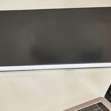 一个现代风格的液晶电视正面视图,纯黑色超窄边框环绕着巨大的纯白色屏幕,屏幕干净无瑕无任何内容,电视底部配备一个银色金属质感的水平底座,底座中央有一个黑色小方块细节,整体设计简洁、极简、具有科技感,采用高对比度的黑白银配色方案,光影效果呈现出轻微的环境反射,营造出专业、高端的电子产品展示氛围,构图居中对称,背景为纯白色以突出主体电视的轮廓和线条。