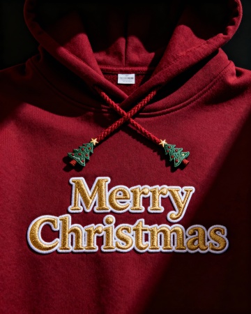 刺绣风圣诞铃铛,重拟物与浮雕质感结合,红绿金配色尽显喜庆,针织纹理背景呼应节日氛围,2025字样传递新年祝福。