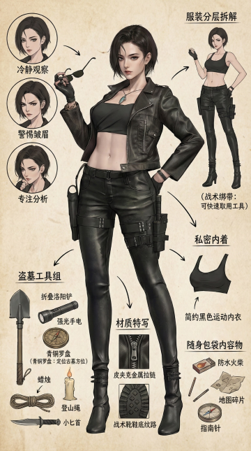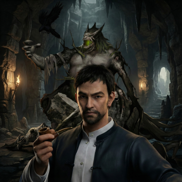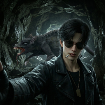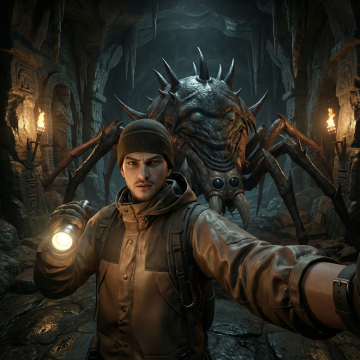 生成人物和怪物的自拍照片,人物在前方,怪物在后方,背景是在古墓里,人物是靠近镜头的,自拍镜头