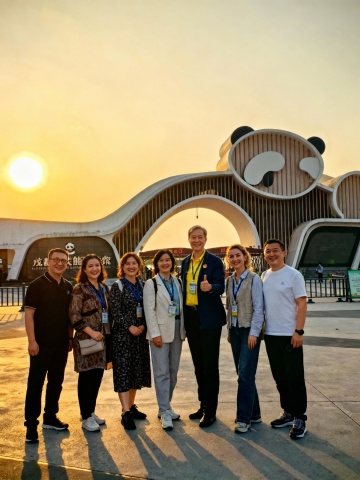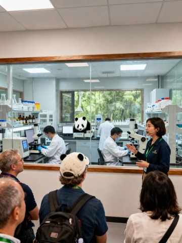 帮我生成成都大熊猫基地导游给外宾讲解的画面,10张