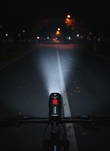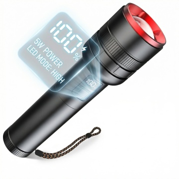 背景是夜晚森林中的地上,一支黑色战术手电筒的特写,一半的体积被雨水浸泡在水中(从地面泼溅而起,激起水花,水花晶莹剔透,折射着光线),背景是森林。