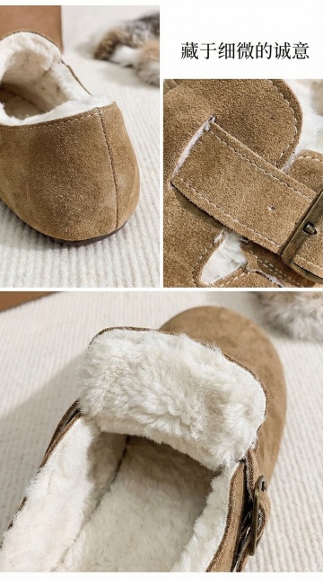 材质深度解析: * 上半部分:超近距离特写牛反绒的绒毛感,旁边放一小块真实的柔软麂皮布料作为视觉参照。 * 下半部分:特写羊羔绒鞋垫的丰厚蓬松质感,可以用手指轻轻按压,展示其回弹性。强调“仅鞋垫部分采用羊羔绒”,定位精准。