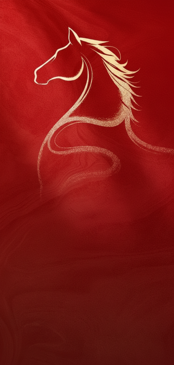 梦幻感与唯美感交织,白描线条勾勒骏马轮廓,粒子风点缀星芒,浮雕质感跃然纸上,插画风呈现优雅意境,暗红底色衬托节日祥瑞之气。