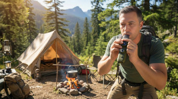 背景是森林中一块灰黑色的石头上,一支手电筒的特写,被包裹在一股泼溅的水中(从地面泼溅而起,激起水花,水花晶莹剔透,折射着光线)