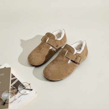 构图:浅米色哑光背景,鞋子呈斜45度角放置,占据画面60%面积。 点缀元素:左下方露出一本摊开的精装书籍(封面为纯色或英文标题),书旁放置一副细框眼镜。 光线:柔和的左侧自然光,突出牛反绒纹理与鞋型轮廓。 文案:右上角一行小字「步履自在,阅读时光」(字体:宋体,浅灰色)。 风格:极简、安静、突出材质与知识分子氛围。