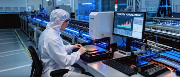现代化工业场景,蓝色为主色调,清新明亮的光线,干净整洁的生产线,透明玻璃幕墙外是蓝天白云,绿色植物点缀在车间角落,机械臂精准运作,地面反光如镜,整体氛围充满科技感与希望