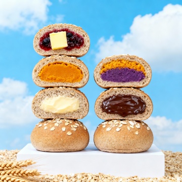 超写实美食商业摄影,堆叠的贝果面包(其中一个切开露出浓郁巧克力流心),放置在质感温润的原木展台 / 展示架上,展台边缘点缀少量麦穗装饰,面包表面带全麦颗粒与果干;背景是明亮蓝天 + 柔和阳光,光线通透温暖,贝果质感蓬松有食欲,展台纹理清晰有质感,细节高清 8K,食品广告级精致画面。