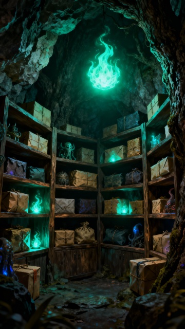 合成人物和怪物的合照,人物靠近镜头,怪物在人物身后,背景是古代洞穴,自拍镜头的构图