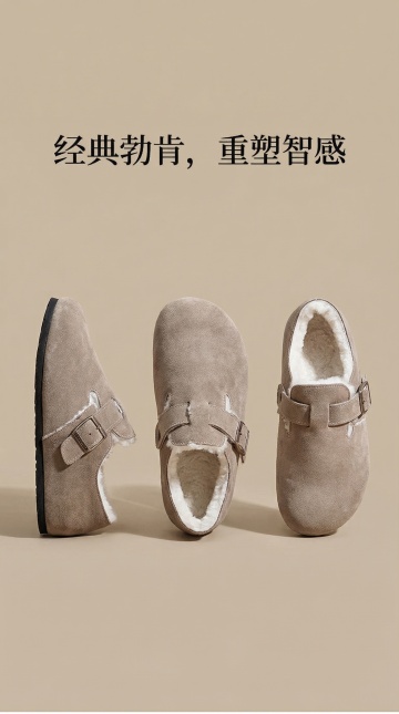 构图: 简洁的拼图或标签式布局。 内容: 核心卖点图标化: 用极简线条图标+关键词呈现,如:☁️“水晶绒内里(保暖)”、👣“符合足弓设计(舒适)”、🔄“两穿设计(便捷)”、🪵“软木乳胶底(缓震)”。 尺码信息: 放置清晰、干净的尺码表(背景透明或与主色调一致)。 颜色展示: 以小色块形式展示所有可选颜色(如:深棕色、黑色、燕麦色)。 文案: “一双懂得陪伴的鞋”。