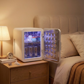 现代简约风边柜,融合性冷淡与轻拟物设计,弧形玻璃门与柔和配色营造温馨舒适感,搭配抽象画作与自然元素,展现文艺氛围。