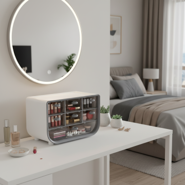 产品是图中的收纳盒 生成一张适用场景图 将收纳盒放在入户门边的边柜上 格子里有钥匙 手表等各种日常用品,场景展示入户门全景 主要展示入户门和入户门边柜上的收纳盒 要求保留产品细节 整体画面协调自然 1:1