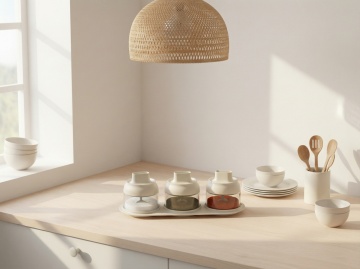 软3D风格的现代简约厨房场景,整体采用明亮的白色调为主,搭配原木色的温暖点缀,营造出清新自然且宁静舒适的氛围。画面以大理石纹理的白色厨房台面为视觉焦点,台面上放置一个浅绿色的盘子,里面装有几颗鲜红饱满的西红柿和被切开的青柠。台面右侧边缘有一个木碗,里面放着一个黄色的柠檬。背景中,白色的橱柜带有简约的木质把手,橱柜上方的墙壁上挂着一个木质挂杆,上面挂着几条浅色的毛巾和几个不同大小的木质锅铲、汤勺。灶台位于左侧,上面有一个银色的锅具,旁边的台面上摆放着装有各种香料的玻璃罐、一个木质砧板以及盛放着彩色水果的木盘。右侧窗户透进柔和的自然光,在台面和橱柜上形成清晰而柔和的光影效果,光线明亮且均匀,阴影过渡自然。整体画面构图遵循三分法,物体摆放错落有致,空间感强,细节丰富,具有柔和的3D质感和平滑的材质表现,色调和谐统一,给人一种干净整洁、温馨宜居的感觉。
